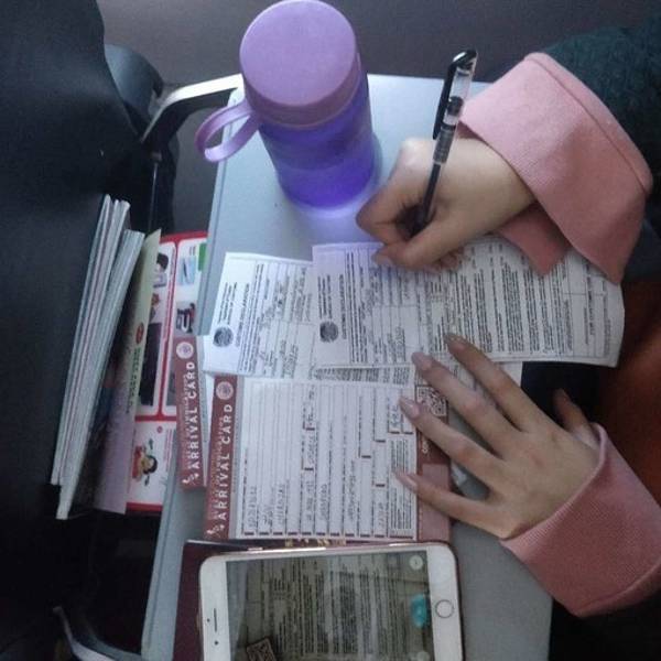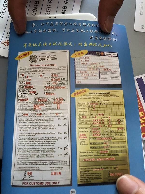 不过一会儿,空姐就发了行程单和一张入境申请表,表格和我之前做攻略时看到的略有不同,请教了下前位置几个小姐姐才填好。上图是具体填发可供参考PS:下面选填一定要都选NO。上面内容大概意思是问有没有携带枪支或管制刀具,有没有携带毒品,有没有带大额现金。10点半左右,就到达了宿务。