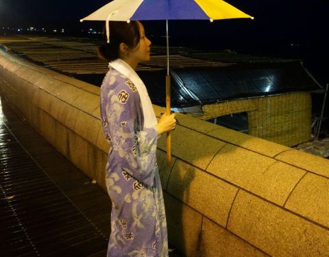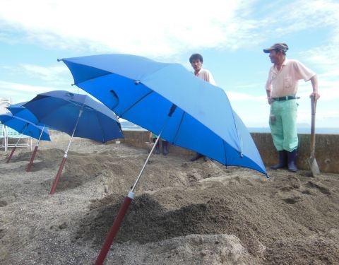 指宿的沙浴就是把人埋在沙子里,用沙子里的热气来达到温泉的效果,最多也就15分钟,汗流浃背,浴衣和毛巾的使用费含在总费用内,楼上还有些简餐。小伞是给脸上挡太阳的