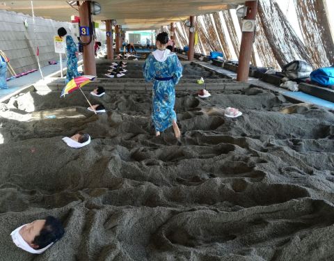 到鹿儿岛,不得不体验指宿砂浴。 在鹿儿岛指宿的很多海边酒店,都提供这种砂浴体验。 换好浴衣之后,来到砂场,会有员工指引你来到一个人形坑里躺下,然后把滚烫的沙子覆盖在你身上,“埋”到只剩下头露在外面。 砂浴的时间因人而异,一般十分钟到十五分钟就可以起身了,当然如果你觉得还不过瘾,可以在稍事休息之后,再躺上一回。 完成了砂浴之后,先淋浴,然后接着泡温泉,让效果更加巩固。 这砂浴的热来自鹿儿岛的火山地热温泉,砂则是火山砂砾,据说效果要比一般的温泉高上十倍。