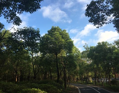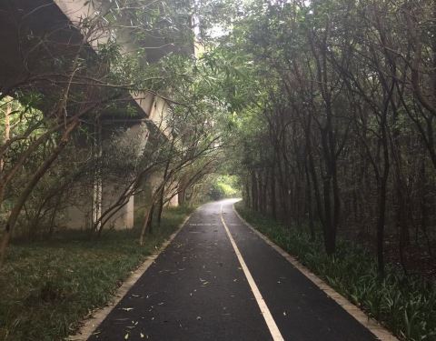 沿5号线沪闵路的绿化带里有一条挺长的绿化步道就是闵行绿道,环境很不错。绿化带隔开了沪闵路上的喧嚣,绿化道有步行道和自行车道,在里面散步就像走在森林里。