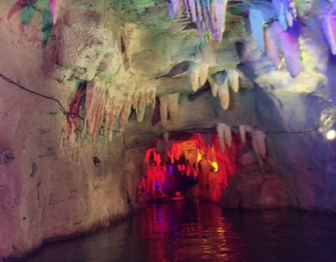 整个景区是人工的,不是真的溶洞,都是水泥做的!外面的水泥破了,里面的铁丝都露出来了。所谓的钟乳石敲敲全是空心的,全是假的,假的,假的。门票每人150。这是我们所玩过的最坑爹的景点了,也算是开眼了。到漂流尽头后也没有车送回起点,还要付20块钱找奔奔车送回去。服务太差太差,3个人只给一个船,扔给你2个桨,其它什么服务都没有。唯一还不错的算是两边景色还不错吧,但那是在路上开车也能看的。