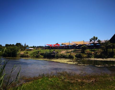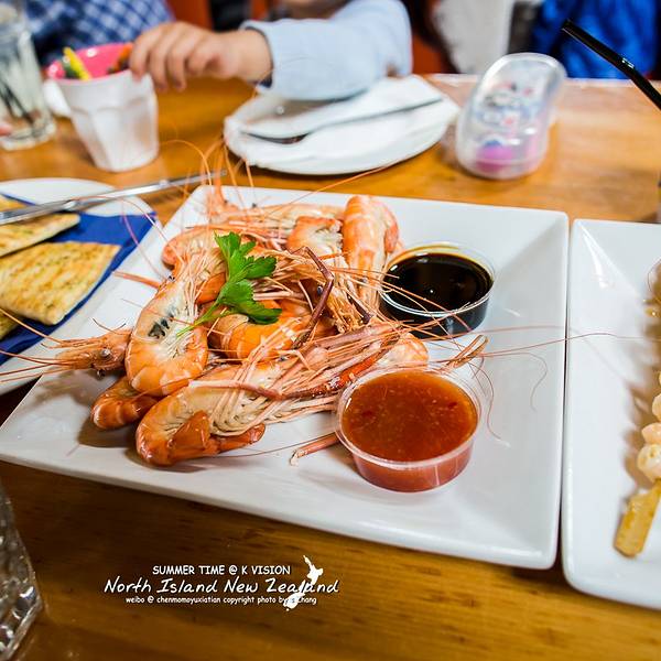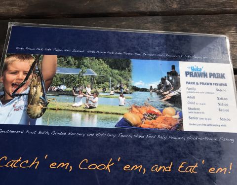 大概在二十多年前吧,Taupo湖的北部靠近胡卡瀑布的地方,被一个农场主弄了个虾场,噱头就是可以吃到刚刚捕捉到的新鲜虾。二十多年前,这里基本就靠一个餐厅营业,然后花个五块钱,还能参观虾场,喂喂虾啥的。现在参观活动取消了,估计没啥赚头,就开放了一些小池塘,花费$75纽币就可以让一家人在里面钓一天的虾,数量无限制,钓好后,餐厅的厨房会帮你免费加工。还是老外对钓虾感兴趣,毕竟这样暴晒一天不是好玩的,而且这里的虾都是大头基围虾,感觉不怎么好。不过新西兰的生活就是慢,大家都是琢磨怎么可以消除多余无聊的时光,所以当地家庭很多人会一大早来到这里,带好野餐的午饭,沙滩椅,成年人就晒晒太阳,小孩子就一直钓啊钓啊,就可以打发掉一天的时光。▼ 室外的就餐区域还不错,后面就是还卡托河,旁边还有秋千,就是风比较大,S说还是在餐厅内部吃比较方便。到点评这家餐厅的时候了,S这位美食家评论到,因为虾种是基围虾,头非常大,味道也不怎么鲜美,一公斤要价$100纽币,跟国内比是天价了。