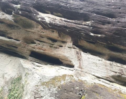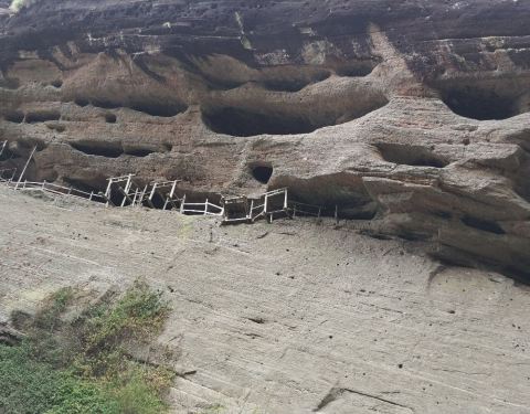 在武夷山大红袍景区内徒步,鹰嘴岩与水帘洞之间有一处神奇的景观,就是武夷山古崖居遗构。这里是武夷山最具传奇色彩的元素,据说是古代山民为了防止野兽的侵扰,以天然山体的洞穴作为屏障而搭建的家园。目前这里还存有当年搭建家园时所用的天车架,据说里面还存有生活场景的遗物,可惜找了半天也没有发现上去的路,细想也是如果轻易就这样上去,也就没有如此神奇的景象了。