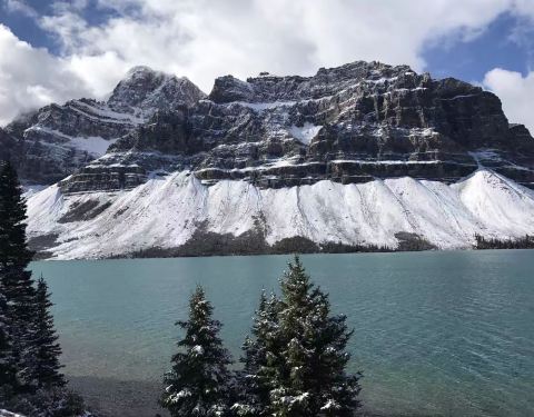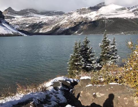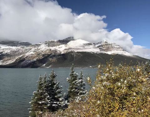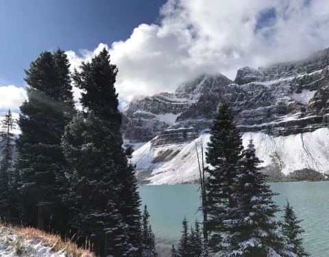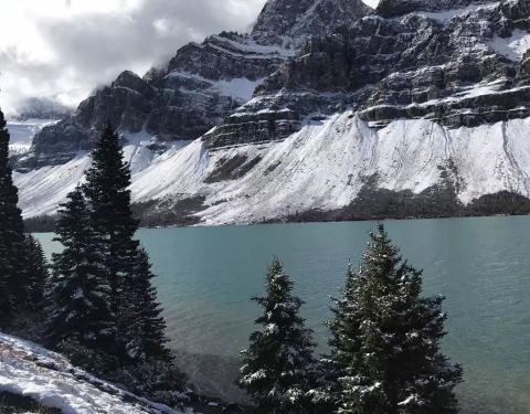 加拿大洛磯山脉弓湖(冰川湖)这里风光真的很好,远方的山峦上还有积雪,冬天去,特别有异域风,这里的湖面并没有结冰,依然流水潺潺,翠绿色的湖面特别平静