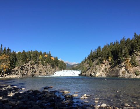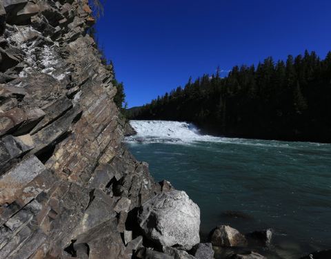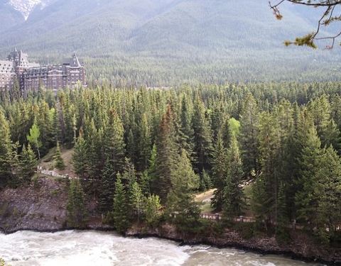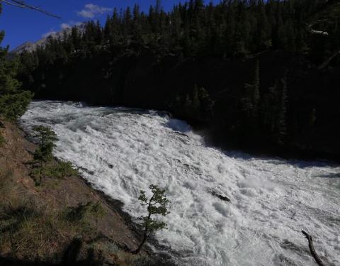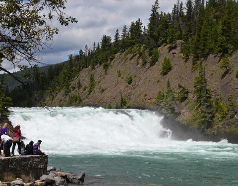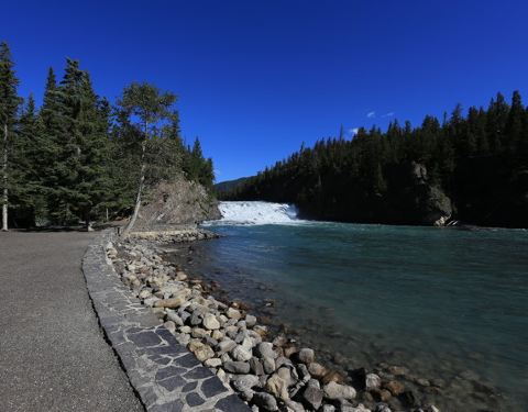 因为时间多,所以到了banff第一天就去了,从下面看更震撼吧,山上看的话,比较一般。弓河瀑布(Bow Falls) 位于班芙镇东南侧,班芙春天旅馆(Banff Springs Hotel)的下方。玛丽莲梦露主演的成名作-电影 “大江东去” 即以此为背景地。 弓河瀑布落差不大,约为10米,虽然只是一个较小型的瀑布,但白浪翻腾,涛声阵阵,轰耳不绝,瀑布巨大的轰鸣声即使在远处都不绝于耳。该瀑布是由弓河的断层所形成,并在此与其支流泡沫河(Spray)交汇,河水湍急,奔腾而下。瀑布两岸皆有沿河健行道供徒步欣赏,并有长椅供游客歇息。
