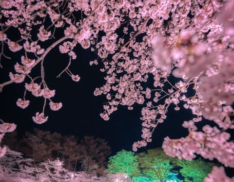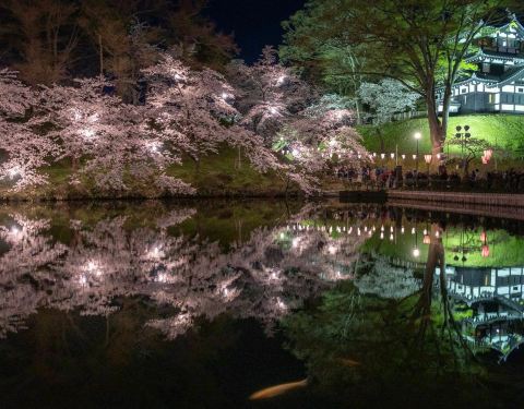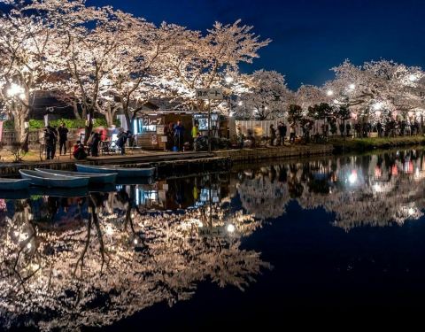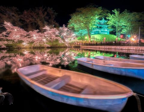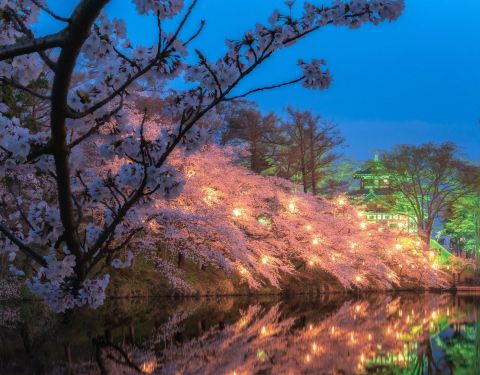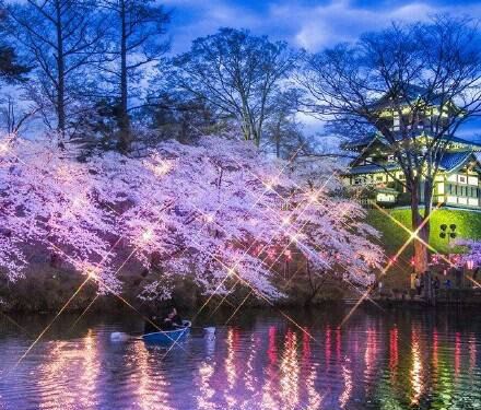 推荐樱花隧道及从极乐桥眺望的夜樱美景,映衬着池水、古老城池,美不胜收