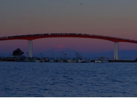 夕阳西下的美景更美不胜收。完美的流线型设计,行走在大桥上可以远眺富士山