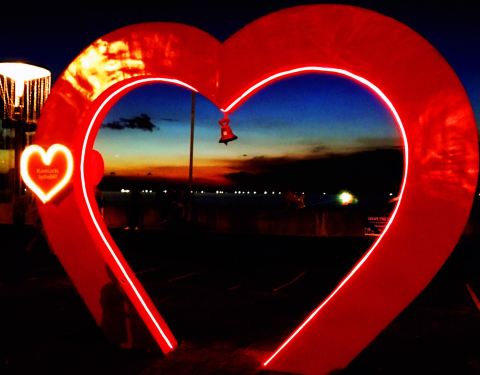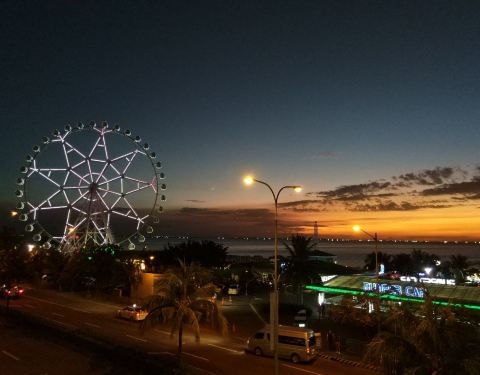 ...是地标建筑,有两条玻璃走廊可以直接通到海边的摩天轮,夕阳下的风景不错,就是海边礁石上有不少垃圾