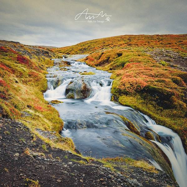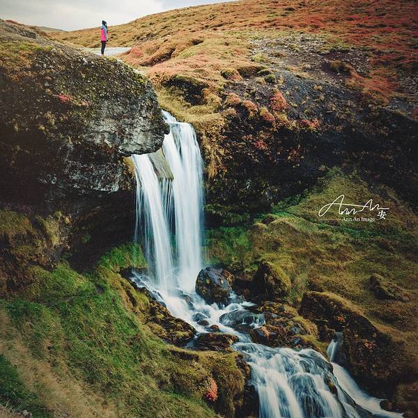 啊,奇幻天地!呼啸风中,看见了冰岛的另一种颜色。 我们循着水声找瀑布,迎着风向远处去。 蓝水塘,红草地,差点错过的风景。在苔原上面长着密密一层红色的植物,冰岛的另一种颜色,寒风中的红色温柔。小小细细的多肉植物也长在苔藓上面近距离看,是红色黄色的小叶循着水声我们找到了瀑布逝者如斯夫