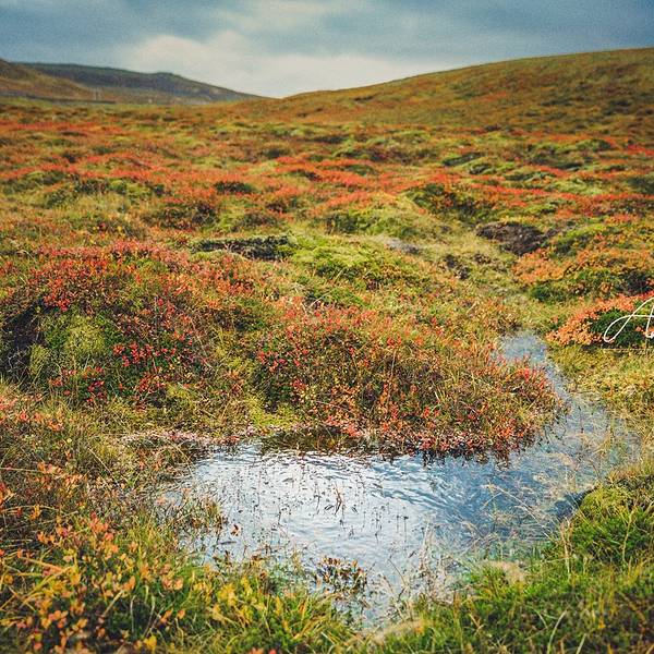 啊,奇幻天地!呼啸风中,看见了冰岛的另一种颜色。 我们循着水声找瀑布,迎着风向远处去。 蓝水塘,红草地,差点错过的风景。在苔原上面长着密密一层红色的植物,冰岛的另一种颜色,寒风中的红色温柔。小小细细...