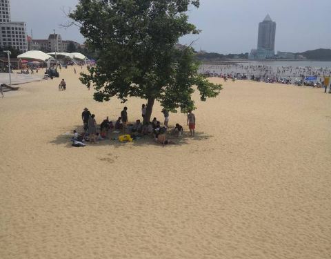 不知道是地形的原因,还是清理及时,这里的浒苔相比其它地方少了很多。蔚蓝的大海,金色的沙滩,引得众多游客前来,虽然距离高峰时万人下饺子的场面还有差距,但人气也足够火爆了。