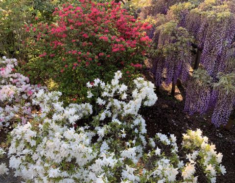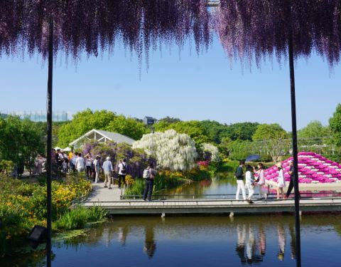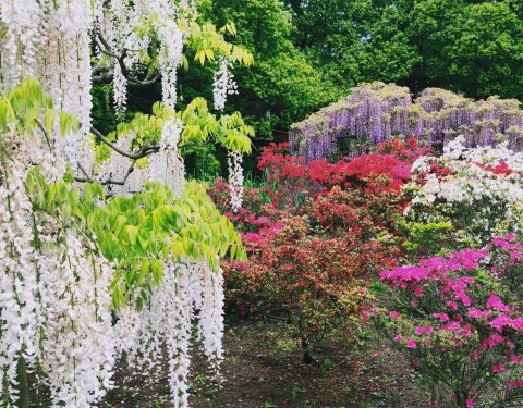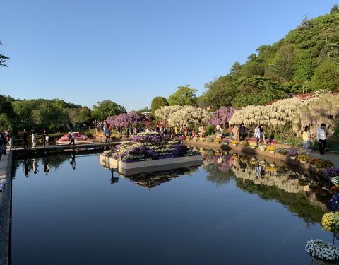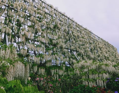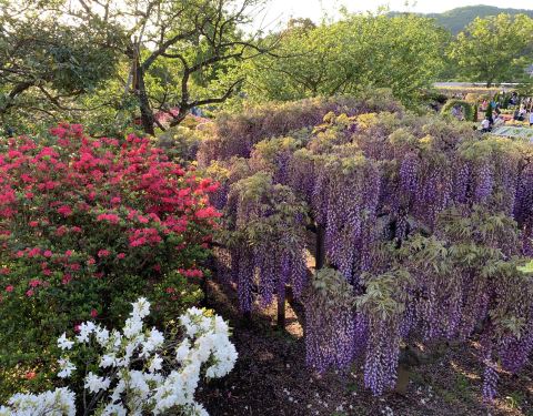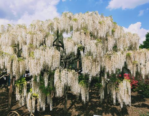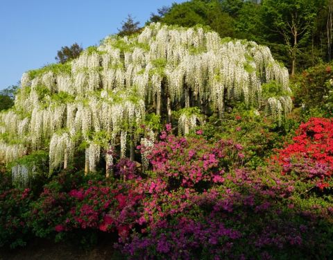 占地92,000平方公尺的“足利花卉公园” 是日本首屈一指的赏藤名所 也是中国CNN报导中 “世界最想去的9个地点”的其中一个 350株以上的藤花 染上各式各样的色彩 最吸睛的 就是 树龄超过150以上的大藤 以及长达80公尺的白藤隧道 白藤花 拥有浓郁的香气 经过隧道时 会被香甜的气味所包围 园内 还有跟藤花很像的黄色金琏花200株 5,000株映山红花等数百种的花争相绽放 真是最浪漫的花香盛宴~