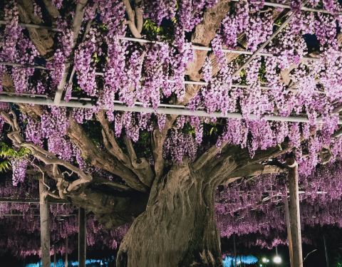 足利花卉公园一年四季鲜花绽放,是拍夜景最美的地方,白天照相不需要任何技巧,到处是花的世界,怎么拍都是美景,这里最有名的就是已有150年历史的巨大紫藤树,紫藤树下拍夜景如同梦幻一般。