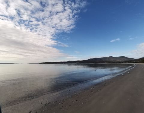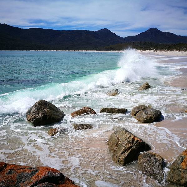 昨天下了一天雨,今天终于放晴了,在青旅吃了挺丰盛的早餐之后,继续攀上我们的热血迷你小巴。每天出发都很早,今天大概八点半多我们就抵达酒杯湾Wineglass Bay的入口处了。从停车场爬到酒杯湾的观景台,大概二十分钟左右,一路上坡,但路况很好,走地挺轻松。 酒杯湾果然没有让我失望,不愧是世界十大美丽海滩,果然是标准明星片的风景。这个时候天空还有点云,所以海水的颜色并不蓝。等我们爬到下面的沙滩,晃荡一圈再爬回来的时候,天空已经完全变蓝了,映衬着整个酒杯湾的大海,碧蓝如洗,太美了。酒杯湾的得名也有几种说法,有些说是这个沙滩的形状太完美,正好是一个教科书般半圆的弧形,看起来像个酒杯;还有一种更心惊肉跳的说法是,以前这里是捕鲸圣地,在鲸鱼没有受保护之前,这里被捕杀的鲸鱼不计其数,它们的血把整个海湾都染成了红色,看起来像是红葡萄酒,所以得名酒杯湾。 其实酒杯湾并不只是一个沙滩而已,而是在周围的群山上有好几条徒步路线,有长有短,有简单有高阶,有些只要一两个小时,有些要走一天,有些可以走上好几天的那种,深度游的话应该也挺有意思。我们从观景台往沙滩走,一路下坡大概要走个半小时。一走到海边,导游大声告诉我们,看那边有四五只海豚正在冲浪。哇,台湾女孩马上叫了起来,她说上次她出海去看海豚,花了很多钱呢,一只也没看到,现在倒是得来全不费工夫。今天的酒杯湾虽然天气晴朗,但是浪还是很大,游泳是不太轻松了。我们就爬到旁边的岩石上,一边吃零食,一边看海。这里的岩石跟火焰湾类似,也有一些橙红色的地衣,颜色鲜艳。坐了一会,不只是看到海豚,还看到一只巨大如轮胎的透明水母,在海水里像一个大型塑料袋一样漂浮。天气越来越晴朗,海水的颜色也越来越漂亮。回程一路往上爬,大概花了四十多分钟的时间吧,回到观景台,再俯瞰一眼酒杯湾,绝世、倾城、惊天下的美。离开酒杯湾,我们又去了一个蜜月湾,基本上就是团员互拍美照时刻。回程之前再去一个农场吃了他们家自制的冰淇淋,短暂的三天行程就此结束,到霍巴特司机再把我们一个一个送到酒店,很贴心。