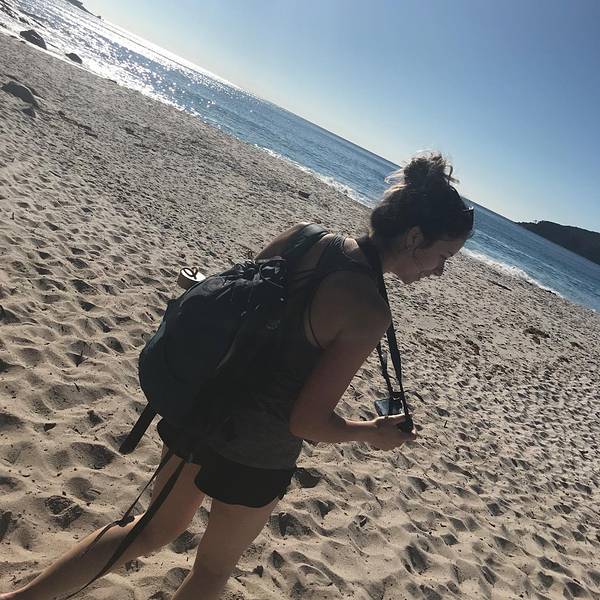 酒杯湾果然没有让我失望,不愧是世界十大美丽海滩,果然是标准明星片的风景。这个时候天空还有点云,所以海水的颜色并不蓝。等我们爬到下面的沙滩,晃荡一圈再爬回来的时候,天空已经完全变蓝了,映衬着整个酒杯湾的大海,碧蓝如洗,太美了。酒杯湾的得名也有几种说法,有些说是这个沙滩的形状太完美,正好是一个教科书般半圆的弧形,看起来像个酒杯;还有一种更心惊肉跳的说法是,以前这里是捕鲸圣地,在鲸鱼没有受保护之前,这里被捕杀的鲸鱼不计其数,它们的血把整个海湾都染成了红色,看起来像是红葡萄酒,所以得名酒杯湾。