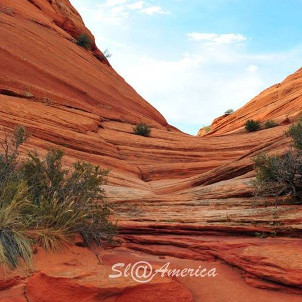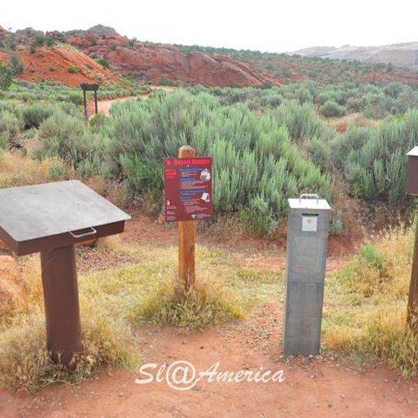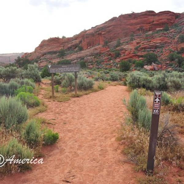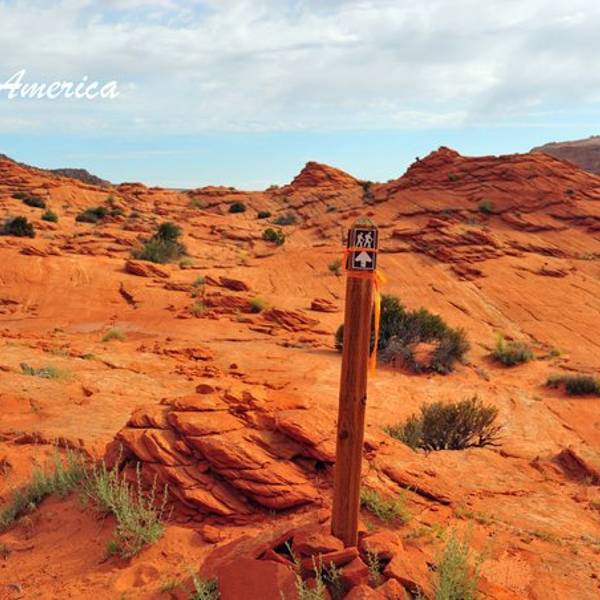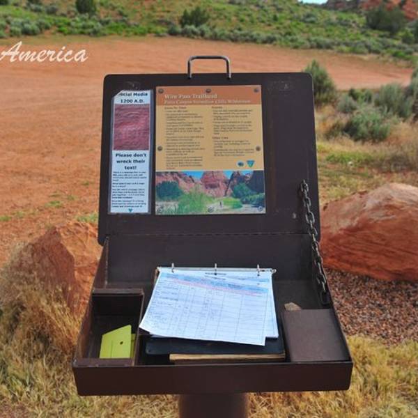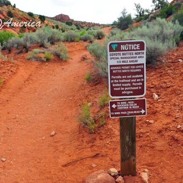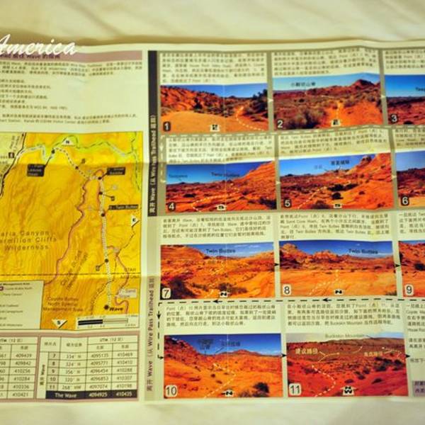 言归正传,开车不久便来到The wave的公路路口,下面主要按步骤介绍下徒步的完全行程。 第一步,找到徒步入口处。 The wave徒步一般都是从一个叫做Wire Pass Trailhead的徒步入口处进入。这个地方位于犹他州的kanab东面38英里处,距离亚利桑那州的page36英里,基本上位于这两个小镇的中间地带,因此来羚羊谷旅游的游客顺道来The wave玩一圈是很方便的,可以提前预定好附近的住宿,方便第二天直接前往。 Wire Pass Trailhead这个徒步入口,并不在主路的公路上,而是需要经过一条叫做House Rock Valley Road的路到达,无论是从Knab或者从Page过去,提前要留意主路旁有一个闪烁的信号灯,这条路的起点就是信号灯的附近。当你找打入口,还要继续开大约8英里的路程,但是这里的路况会不太好,都是不平整的土路,开过去会比较颠簸,在平日里小车是完全可以通过的,如果遇到下雨天,一般则需要高底盘车通过,一定不要冒险前往,这类地方一般租车公司的保险是不包含的,如果遇到意外,只能自行叫拖车处理,但在里面很可能遭遇没有信号的尴尬局面,如果有事故,很可能会依靠过路的车来进行求助或者救援。 其实,还有个最为简便的方式,就是在Google map里提前设置好导航信息,跟随导航进入即可,但一定注意要提前设置好导航信息,进入里面就没信号了。还需要注意一点的是,这个地方正好处于犹他州和亚利桑那州的交接地带,时间应该是按照犹他州时间来进行计算,如果从Page方向过来,可能要有一个小时的时差问题。也由于这个问题,我们和前一天的那队中国朋友错过了约定的时间。 House Rock Valley Road的路况情况第二步,做好徒步前的准备工作。 从主路一直往里开,基本没有什么分岔路口,按照指示牌的指引就可以来到下图的这个位置,也就是The wave徒步真正的起点,Wire Pass Trailhead。 这里有片还算比较宽阔的空地,是个小型停车场,基本上一天来这里的车不会很多,看到之前的车停在哪,你也停在旁边即可。这里有个非常简陋的厕所,据说每天当地的管理人员会来清理一次,如果不是特别急需情况,还是忍忍吧,里面有点混乱。一路开过来的土路。一些简单的关于The wave的介绍。开始徒步前,首先要确认的是,是否带足了水和必须的食物。官方对于带水的建议是,每个人需要带3.75升的水,由于徒步线路内部没有信号,以防发生迷路等突发情况,同时也需要携带上至少一天的补给品, 因为据说这里的管理人员一天只会来一次,查看是否有游客没有从园区中出来。 可能不少人会有疑问工作人员是怎么查看游客是否从园区出来的?下面这张便提供了答案。同时,这也是徒步前很重要的一个工作,就是登记徒步人员的信息。打开图示中的铁盒,里面会有人员登记信息表,填写好徒步的人员数量,姓名和应急电话等信息后,便可以开始徒步之旅了。当然,从景区回来后,也要在你的信息后面标注下已返回,这样方便工作人员查询是否有未归人员。还有就是,出发前,要将你的许可证的一部分摆在自驾车前面,一部分则要挂在徒步者的身上,以备工作人员的检查。下面就是徒步的真正起点了。第三步,按照指示图示寻找徒步方向。 首先,晒下官方的徒步指示图,园区内部没有任何手机信号,你所依靠的也仅仅是下面的几幅图和相应的文字描述,这也是The wave徒步的最大难点和有趣的地方,给人以探险的感觉,强烈建议方向感不是很好的女生结伴出行,这里要走丢的话,可不是闹的,毕竟来这里的人一天基本也就是那有许可证的20个人。 这里也提示下,来这里徒步的游客,尽量要早点出发,我们大约是早上7,8点就到达了徒步的入口处,而停车场里面已经有一些车停驻了。早出发的最大优势在于,基本上来这里徒步的人,绝大部分都选择一大早出发,这样可以保证日落前可以回到起点,同时也可以增加你遇到其他同行者的几率,毕竟人多走丢的概率会相应的减低很多。下面就开始真正的徒步之行,最开始的一段路是整个行程中最为简单的一段,基本要沿着河道走一个U型弯,便可以看到第一个图示的位置,留意路旁的指示标示。路上的野花。下图就是图示一的位置,看到这个牌子就证明你走在了正确的道路上,当然第一段路并没有岔路,这个标识牌的位置其实算是第一个岔路,前面还可以继续沿着河道走,但就去往别处了,正确的路线是随着牌子的方向上小山坡即可。然后,继续沿着小山坡一路上行,这里覆盖着很多杂草,但明显可以找到中间路的轨迹,跟着走即可,这时四周都是山峰,已经可以看出些河水冲刷过的痕迹。一路随着下图中的路前行,并没有岔路,比对下图示二的方位即可。下图中面前的山峰就是接下来你要爬的路线。这里高能预警,我认为从草丛中的小山坡下到山峰前的地方是整个行程中最容易迷路的地方,可能你在去往The wave的路上还不觉得,当你回程时,你会很难分辨你下来的土坡到底是哪个位置,因为周边的草丛都长一个样子,强烈建议园区的工作人员在正确的路口处放上醒目的标识,否则真的很难以辨认。一路走到草丛的尽头,便可以下到下图中的山峰面前,按照图示中的路线爬上前面的小山峰即可,这里可以跟随地上的脚印前行。爬上上图中的小山峰,你便会来到图示三所在位置,这时候由于你已经在高处,可以远远的望到The wave所在的山峰的大体位置,沿着坡道一路前行即可,这里基本不太会迷路。一直前行,便可以很明显地分辨出前