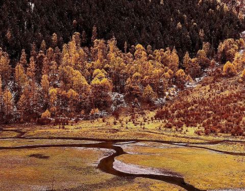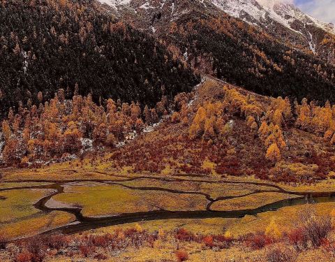 阿坝小金县虹桥沟的景观由原始森林、积雪、沙棘林、高山草甸、飞瀑、湖泊等组成,在不同的季节里呈现出不同的景色。秋季,这里是色彩的天堂。从沟口进山,沿途陆续呈现森林、草甸、海子、雪山等景观。