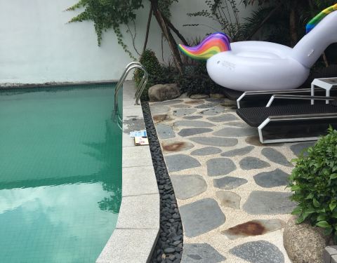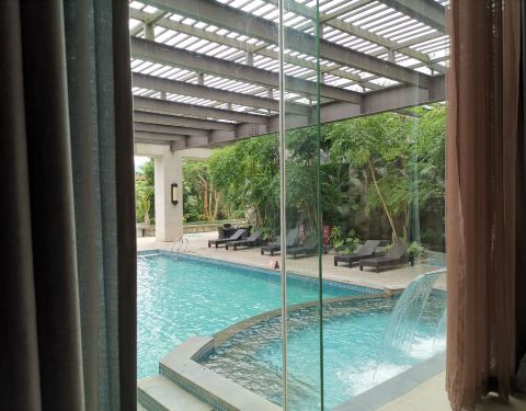 完全是骗人的点评。找人免费体验酒店写好评拍照。这里说不上酒店服务。设施陈旧环境差又脏。房间内部设施很差一点都不如一家星级酒店。先说下温泉区吧沙子粗的不行又脏,漂流道看到都发抖不敢下去玩满条漂流河道长了青苔。冲浪池垃圾多的不行水也混浊的不行。游泳圈发霉的救生衣也发霉的不穿救生衣又不可以玩冲浪。滑梯呢很旧了也有些脏。网红百米泳池水混浊的不行,泳池底又滑又不干净。所谓的网红酒店根本是买回来的点评和一些狠狠修图的找骗。我们这次住的新联排泡池房一拿到房发现洗手间臭死了没搞卫生投诉两次居然都只是派个清洁工来通厕所拖了很久才给我换个房间,这服务真是差劲极了。酒店的床旧不说沙发也不太干净的。看到对面有私家泳池的别墅那些所谓的网红泳池对面都能看到脏的吓人哪敢下去玩拍照都不好看了更别说什么漂浮下午茶了。这酒店差的没有性价比可言。请也不愿意去第二回的那种。奉劝各位旅友不要给网上点评骗了。