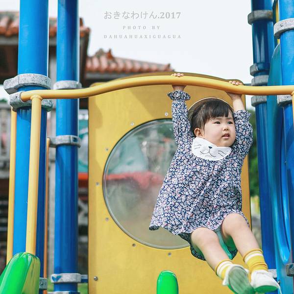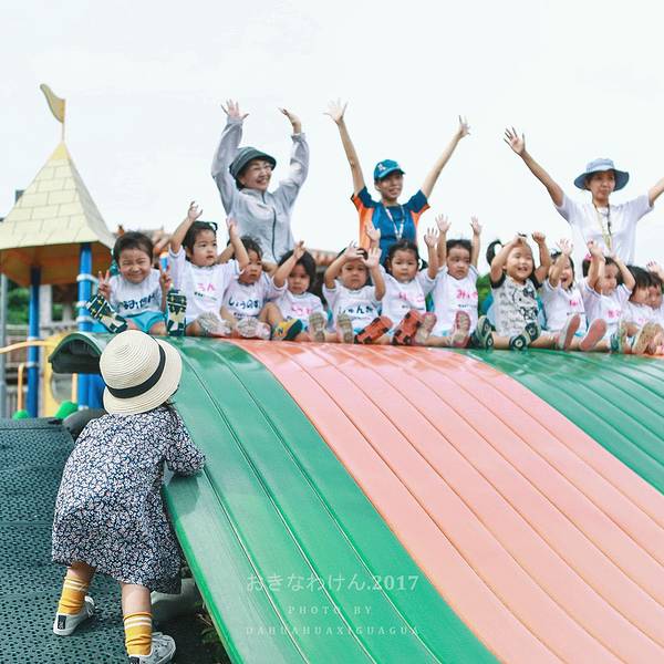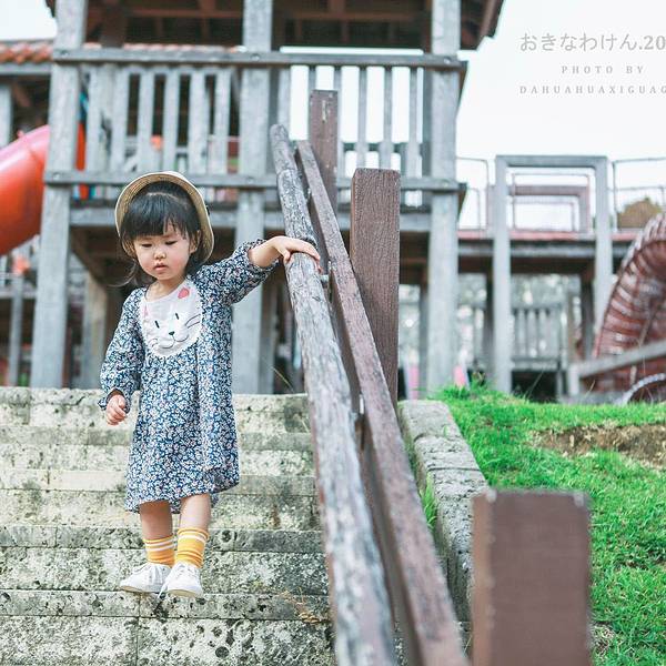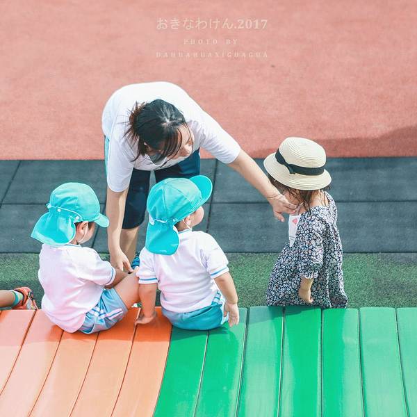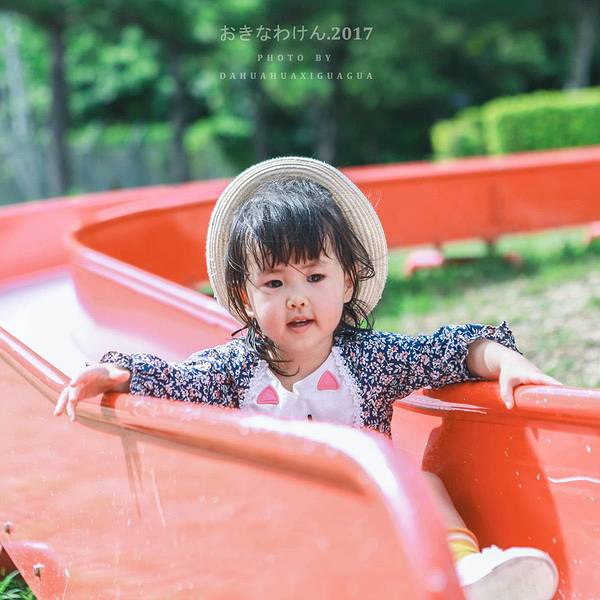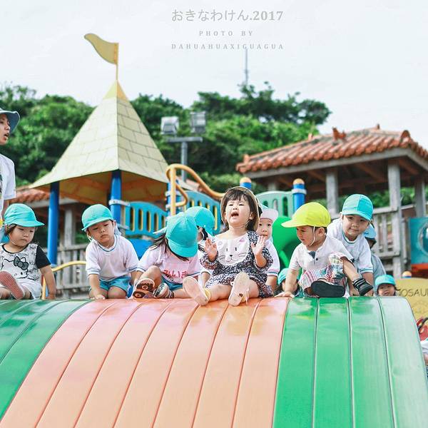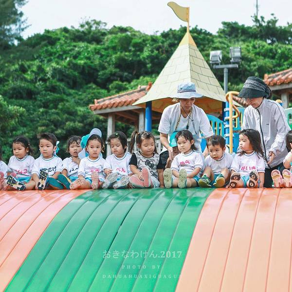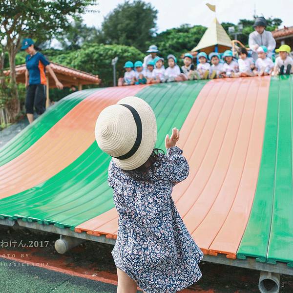 正好有一群日本保育园的小朋友来公园玩,一大群孩子,年纪都是2岁上下,就由三个老师带着。都很可爱活泼,关键还都很守纪律。豆豆坐在宽滑梯上,看着旁边有几个小朋友,就一拍手,喊“预备。。。滑”:结果没一个人滑下来,就她一个人滑了下来。转头一看,几秒钟的时候,小朋友都坐成整齐的一排。她又来兴致了,一拍手,喊“预备。。。滑”:当然还是没人理她,小朋友们准备拍照呢。豆豆看没人滑下来,又跑上去,在旁边指挥“预备。。。滑”:算了,真没人不听话的滑下来。放弃。我担心的事还是发生了。一个小男生滑的时候不小心用脚碰到豆豆一下,豆豆哪能分得清是不小心还是故意呢。一滑完,豆豆就炸毛了,要扑上去。日本老师赶紧轻拍她进行安抚,还轻声说些什么听不见(听得见也不听不懂),豆豆很快消气。小朋友的喝水时间到了,老师一指挥,就迅速排排坐到小亭子里。由老师拿着将满各种水杯的篮子,每个人自己取出自己的杯子。喝完水后,又挨着把水杯放回篮子里。旁边还有个小长滑梯,再玩几把。接着,下一站是残波岬,因为这个时间段,天气好极了,所以对这儿印象也特别好,虽然也是挺小一处。