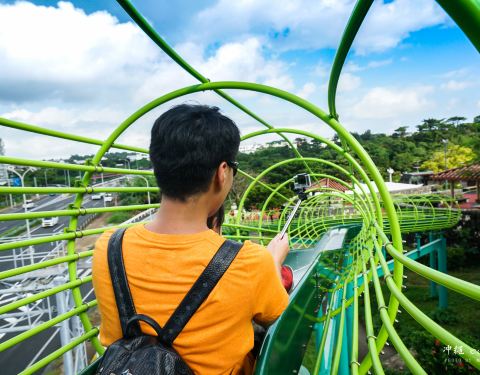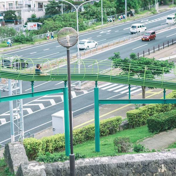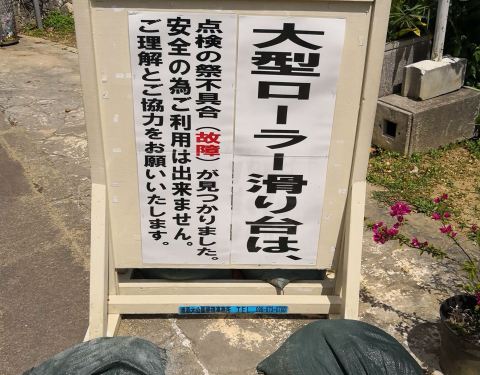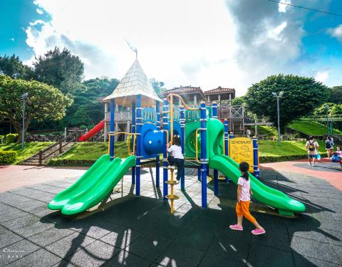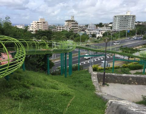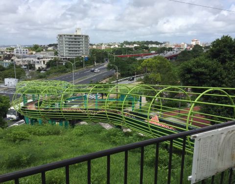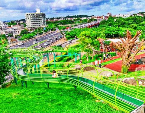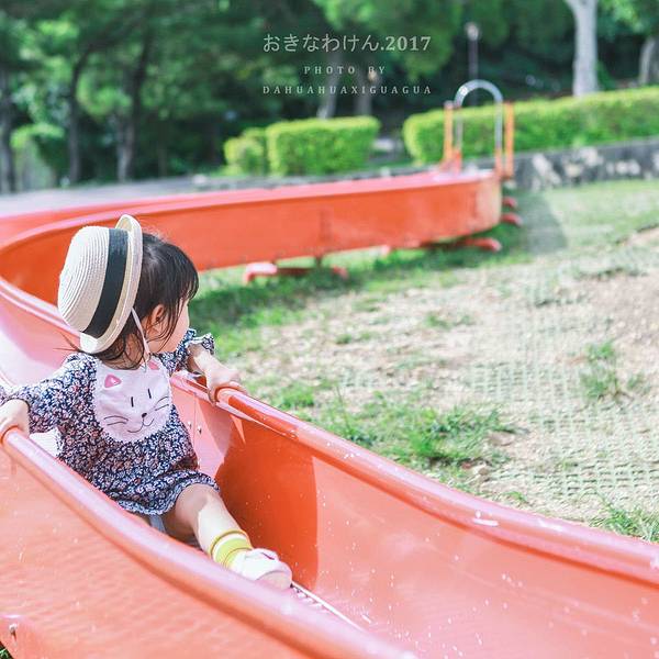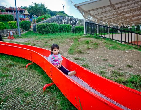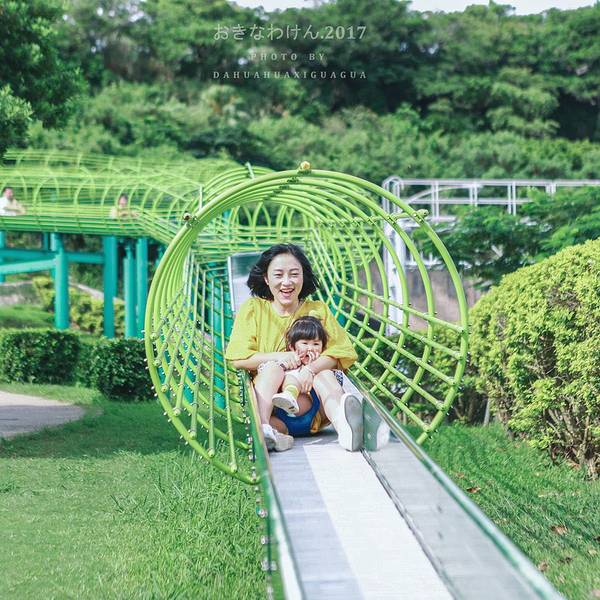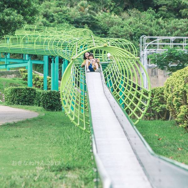 第一站是浦添大公园,这个真是要么上午来,要么傍晚去,反正就是不那么晒的时候再去。否则大滑梯上的滚轮要是被晒得滚烫,那滋味。。。大滑梯看上去真是壮观,像个巨大的绿龙,长度超100米。大人小朋友都玩得嗨。不过,要注意滑的时候用脚登着控制速度,别用手扶着控制,否则可能擦伤。另外,腿和手臂也别挨着两侧的护板,因为快速滑行的时候,也容易擦伤,别问我为什么知道,因为我的腿现在正在结疤。