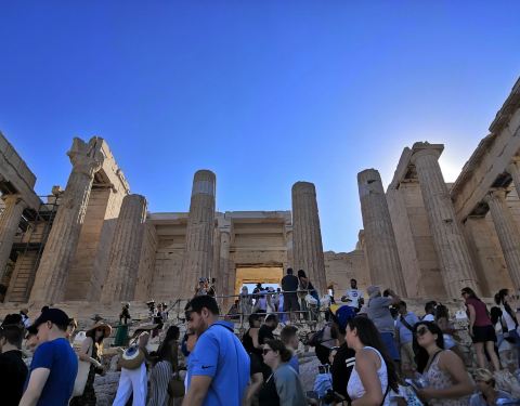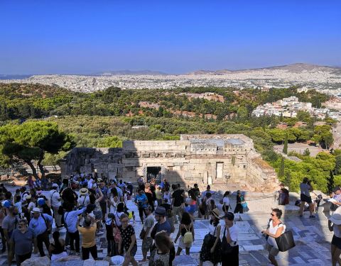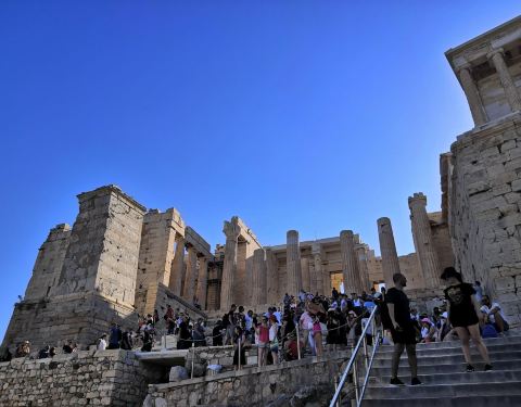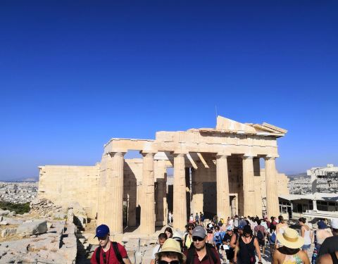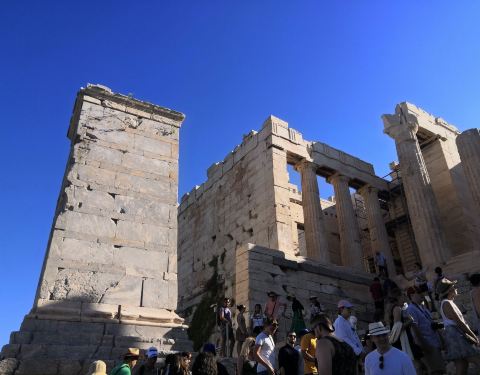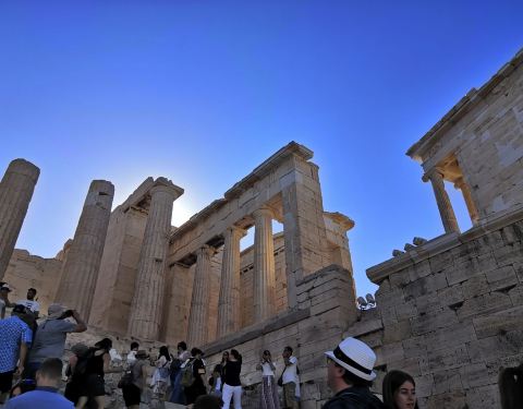 卫城山门是卫城的真正入口,多利安式及奥爱尼亚式列柱巧妙地穿插并列,气势雄伟卫城山门是卫城的真正入口,多利安式及奥爱尼亚式列柱巧妙地穿插并列,气势雄伟。以前山门是由两侧的宫殿组成的,如今仅剩五个门的柱子。这里是进出卫城景区游客必经之路,所以总是显得人满为患。