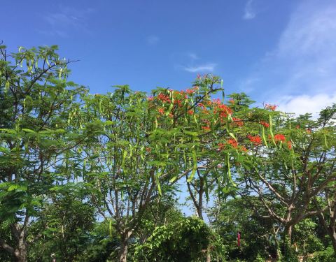 停车场下来是ticket office 不知道是否收费,导游看起来就是打了招呼而已。越南文字看不懂,这个可以俯瞰潘切市区的占婆塔其实是有点落魄的,道路没有完全修理好,有石子,路旁的长着长皂荚的树还是蛮抢眼的,盛开的三角梅也是极为抢眼。