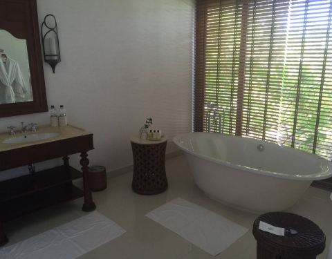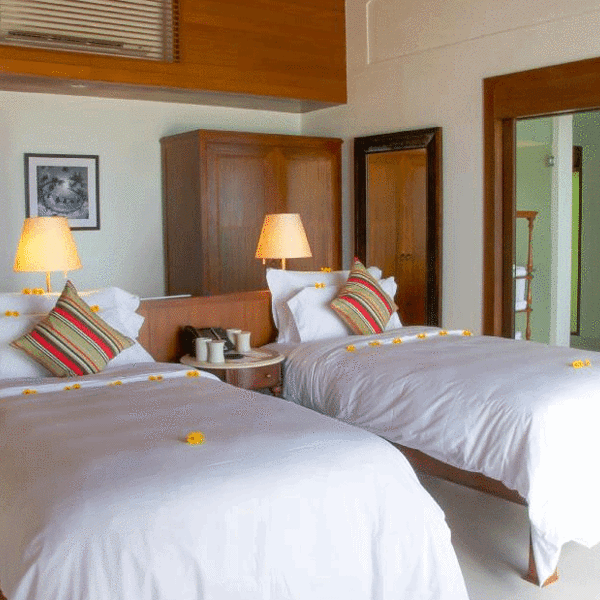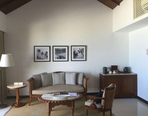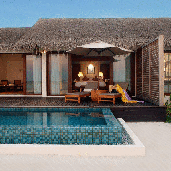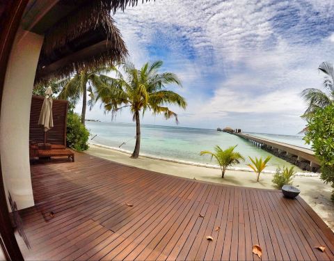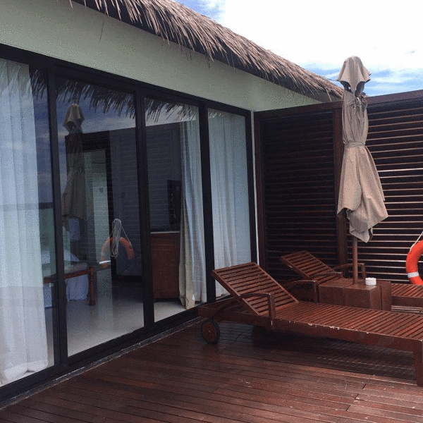 ...经跟着小黑走到岛屿最南部,光看位置就很不错,附近只有Spa中心、拖尾沙滩和健身房,私密性非常好上岛后先check in, 稍歇后跟着中文服务员看房。先带大家看看我住的沙滩别墅:沙滩别墅是日出朝向,一进门首先是客厅,转左是主卧室,主卧室继续往里深入是带浴缸的浴室和厕所。而室外淋浴则设计在甲板旁边。别墅...上岛后先check in, 稍歇后跟着中文服务员看房。先带大家看看我住的沙滩别墅:沙滩别墅是日出朝向,一进门首先是客厅,转左是主卧室,主卧室继续往里深入是带浴缸的浴室和厕所。而室外淋浴则设计在甲板旁边。别墅共138平方米,除去露台甲板是85 平方米,我一个人睡真是爽到炸。浴室一角每间房都标配空调、电视、国际电话、免费WiFi、迷你吧、咖啡和茶冲泡设施、免费瓶装水、洗浴用品、吹风机等。每天每栋别墅提供3-4瓶1升的新鲜饮用水。因为我提出想先看看房间,所以稍事休息后咱们马不停蹄地回到码头和服务人员集合,我们沿着栈道开始考察每个房型。沿着北边栈道走,首先来到了双卧水上泳池别墅。进门后首先是一条长廊,往前是客厅,往左是主卧(大床房),往右是次卧(双床房),两房均有独立的浴室(带浴缸)、厕所和室外淋浴。从两间房各有一扇落地窗通往超大甲板和泳池。实拍拍不出这个效果,所以拿了俯瞰图我觉得这里的地段不错,附近就是主餐厅、酒廊、沙滩酒吧、水上运动中心、潜水中心,吃的玩的很齐全。但是缺点是私密性不够,两边分别是基础水屋和沙滩,而且离拖尾沙滩好远~要从北往南穿越整个岛。后来我才知道,原来还有两间同样的水屋在岛屿最南边!这个就看取舍了,具体房号和对比大家可以私聊问我。潜水中心远景随着栈道继续深入,接下来是水上别墅:一进门,面积比双卧小了一半不止,有点心理落差…房间格局和海滩别墅类似,直接来到房间后的甲板,这里有扶手可以直接下泻湖浮潜,可是设计有点奇怪,楼梯不是直接伸到水里,还接驳了另一段。逛栈道时小爱发现,原来栈道两边都有水屋,意味着水屋有日出日落两种朝向,下次帮客人订房,就可以提前申请朝向了,嘿嘿……水上别墅旁边就是水上泳池别墅,其实格局和设计都差不多,连面积都一样,只是多了个泳池。噢对了,泳池水深1米2,女生到胸口男生到肚子,小孩要注意哦!沿着栈桥一直走到尽头就是豪华水上别墅,小爱感觉布局、设计都和水上泳池别墅,估计贵就贵在私密性和景观好吧,毕竟就它一间朝着外海,正对日出还可以欣赏无敌海景!面积比泳池水屋稍大,占地面积182平方米,室内面积100平方米。沿着栈桥往回走到小岛东边,是一整排沙滩别墅,普通沙屋和泳池沙屋交错排列。两者的陈设、空间设计都差不多,不同之处在于泳池沙的卧室后开了一扇落地窗,可以直接步行到另一块甲板,也是游泳池和凉亭的地方,泳池再往外就是沙滩啦!顺着沙屋前的栈道一直走到尽头,就是双卧沙滩别墅。不知不觉小爱已经跟着小黑走到岛屿最南部,光看位置就很不错,附近只有Spa中心、拖尾沙滩和健身房,私密性非常好。双卧沙屋占地面积273 平方米,刨除露台和游泳池后是149平方米,进门后一条长廊,往前是客厅,往左是主卧(大床房),往右是次卧(双床房),两房均有独立的浴室(带浴缸)和厕所。从两间房各有一扇落地窗通往超大甲板和泳池、沙滩。双床房布置 展开
