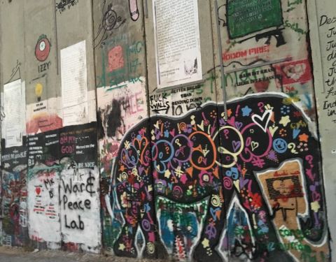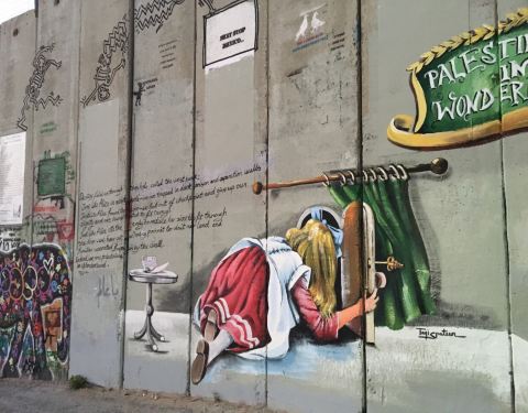 冷冰冰的灰色水泥墙被涂鸦上了色彩鲜艳的图画,体现了巴勒斯坦人民对生活充满了美好的愿望。