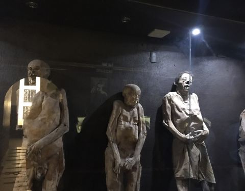 非常惊悚的一个地方的,我在里面也是匆匆看了几眼就出来了,因为这里基本上看到的就是赤裸裸的干尸,我以为会是埃及或者希腊看到的那种木乃伊。