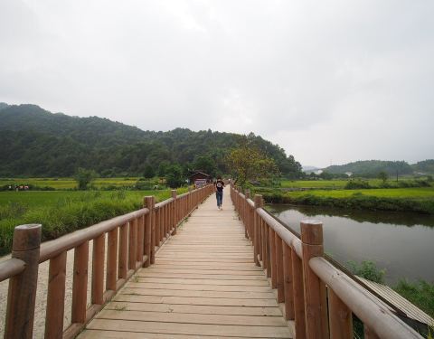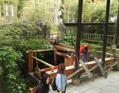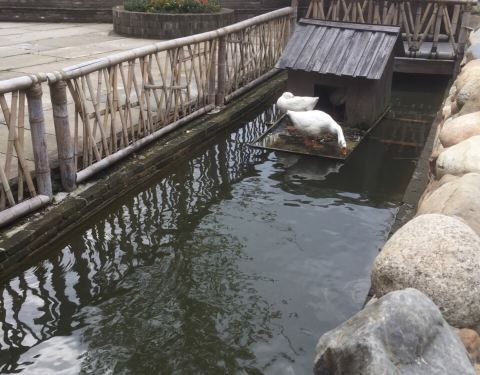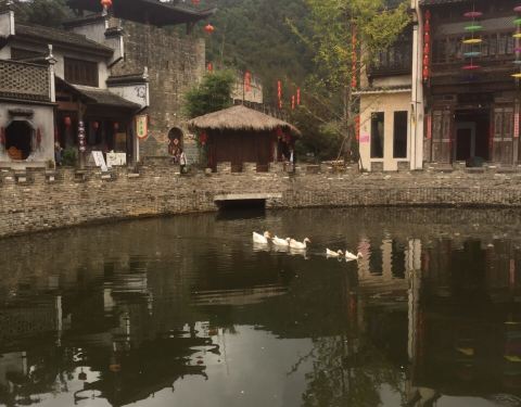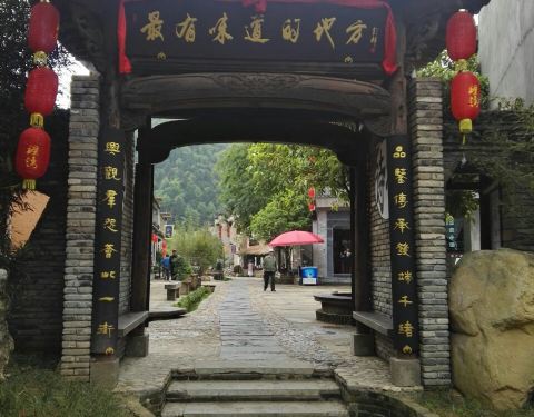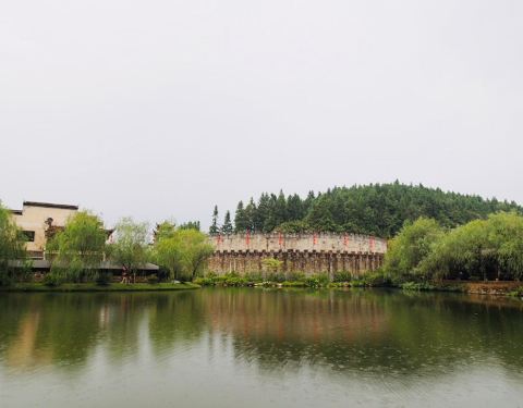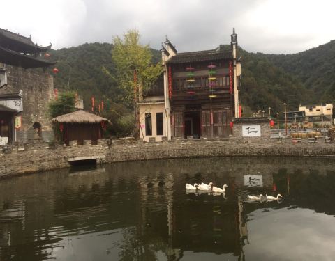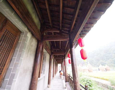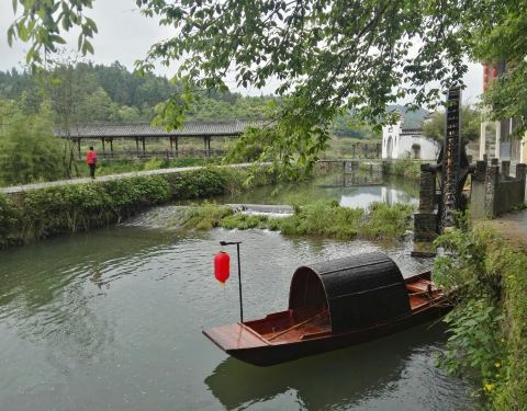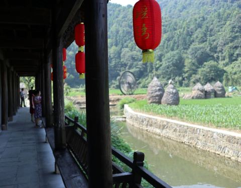 坐车去的婺源,舟车劳顿好几个小时,有些疲惫,然后第一站就是这里,据说是个得志青年花了5000万元打造而成,跟一山之隔的思溪延村相比,这里更商业化,更规整些。会路过一大片的稻田,一派丰收的景象。location就在考水村两里外的山坳中,有群山围绕,也有溪水潺潺,漫步这里走走也还ok。 进了大门就看到有好多的小吃,像油墩子之类的,路过一个摊位,买了豆花和绿豆汤,味道还行,苍蝇稍微多了一点。其他还有酿酒坊、小手工、制茶和私塾等等,还原了此地祖祖辈辈们的生活方式。再进去还看到有进士第、文昌阁、郡马楼等;宗祠古院、琴房书院、舞榭歌台不一而足还有一段城楼可爬。民俗景观也有好几处,像油榨、亭阁、牌坊、廊桥、福堤、瀑布、古戏台、念恩堂等,很好得演绎了考川千把年的历史文化,有个戏台还蛮有看点的,门口的拴马石柱还有顶部的藻井一样起天然扩音效果的设计无一不体现古人的智慧。随便看看还行,提前1-2个月还能看到大片荷塘中荷花盛开的景象,现在基本都谢光了~