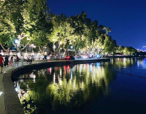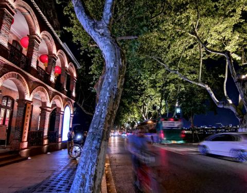抱青的色调是令人心动的!一长溜的北山街,就数它最夺目。红色砖墙的拱形设计,一条长长的骑廊,不经意间流露出民国时期的种种经典。可以想像,当年的它是如此的显赫!能在西湖边立幢别墅的都非等闲之辈。占据了一整个里西湖,位置更胜于其它。曾经,这里是达官贵人出没的地方,甚至数年前,仍可在此觥酬交错,沉迷于醉人的夜色。如今,这里已没有了世俗气,有的只是书画的浸润,配着夜西湖,国色吞香......