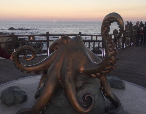 浦项市虎尾串迎日广场,一个观赏日出日落的绝佳去处,落日余晖,美不胜收!日出广场作为新千年韩民族迎日庆典举办的场所。广场中最引人瞩目的要数纪念造型物相生之手了,也被称为“托起虎尾串之手”,整个造型使用了青铜的材质,不仅仅象征着大海和陆地的和谐相处,还有这非常好的意义。这里是韩国的最东边,每一天最早迎接太阳的地方。也是个朴素可爱又美丽的小渔村。闭上眼睛,吸着空气里海的味道,感觉好像回家了。多想留在这里啊,可以慵懒的发呆,傍晚溜达到海边的排挡,伴着海风,煮碟海螺,来杯烧酒,然后醉在这里。