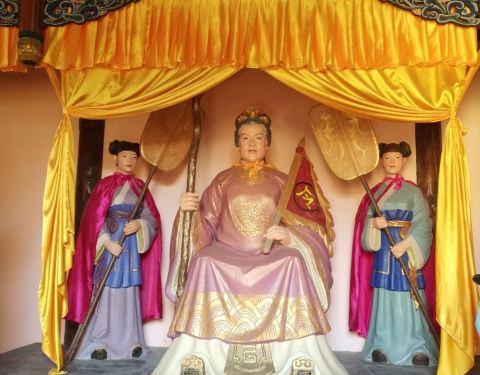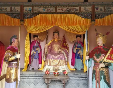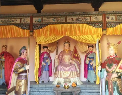 古北水镇的杨无敌祠整座祠堂分为两个部分,殿供奉杨令公及他的八个儿子,后殿供奉的是佘太君及杨家女将。 正殿中央有杨继业的坐像,他的八个儿子分列坐在东西两侧。再登上许多台阶,到达后院的殿堂,中央坐着佘太君,两旁分立着穆桂英和杨排风。