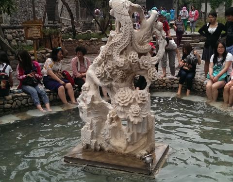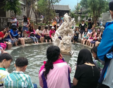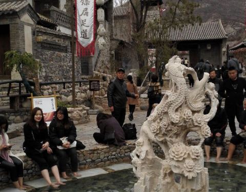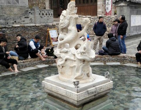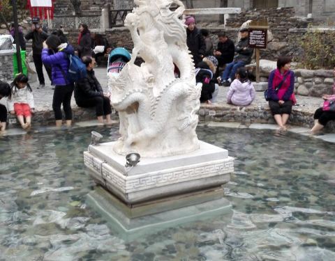 在古北水镇中心位置,距震远镖局不远处有一个小广场,广场中心有两个圆形大水池,池中各有一座汉白玉雕塑,雕龙的为龙池,雕凤的为凤池,合称龙凤池。 池中是温泉水,据说水温常年保持37度。 龙凤池是免费为游客开放的。在小镇游览时间长了难免感到双腿疲乏,在这里做个足浴还是满惬意的。