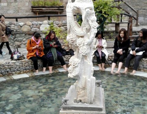 在古镇转悠忽然之间,发现前面有两个白色的水池,冒着热气啥事特别,着了许多游客,脱了袜子把脚放进去,每个人脸上都戴有笑容。