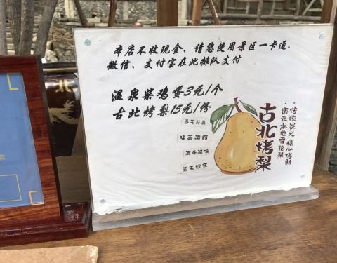 很多人在那里泡脚啊,真的是脱了鞋子袜子坐在池子边儿上,脚丫子伸进水里在那里泡脚,我实在是有点接受不了。 旁边是古北烤梨,泡脚的人有些就正好买了梨和水煮蛋,边泡脚边吃东西,好自得的样子。