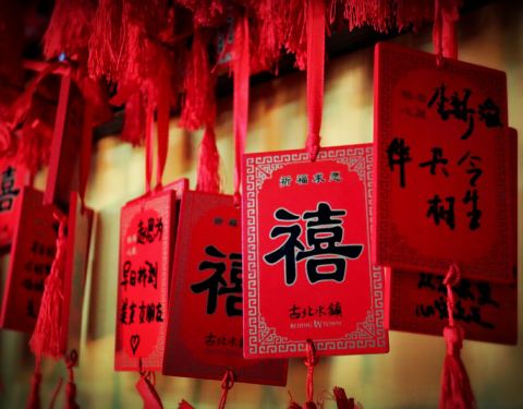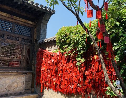 古北水镇的月老祠,据说挺灵的。一个个的小红牌牌挂满了墙,但愿都能够有情人终成眷属