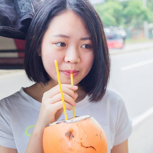 在路上,喝了椰子