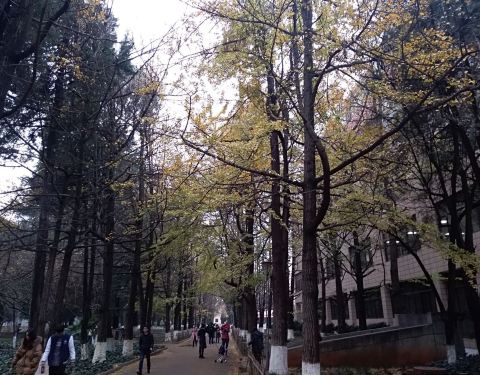 云南大学的银杏大道是小有名气的,可惜的是,我去迟了,银杏树的金黄色树叶己经是掉了几天了,树上留存下来的叶子己经稀疏了,拍照就不够好看了。