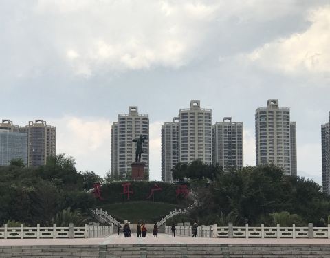 由高处俯瞰,聂耳音乐广场的造型是一把巨大的小提琴,尤其在晚上,霓虹闪烁,景色更为壮观
