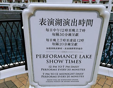 在新葡京酒店的旁边,穿过地下通道,来到永利这边。从通道上来就会看到一个很大的水池出现在面前,绕过水池前往永利的正门,这个时候音乐突然响起,静静的喷泉也转眼间就变得热闹起来。既有悠扬的中国传统音乐也有激昂的百老汇名曲,喷泉的舞蹈会时而舒缓时而激昂。在每天上午11点以后,喷泉才会表演,全长时间三分钟,每隔15分钟又会重复一次,一直到晚上的9:45。