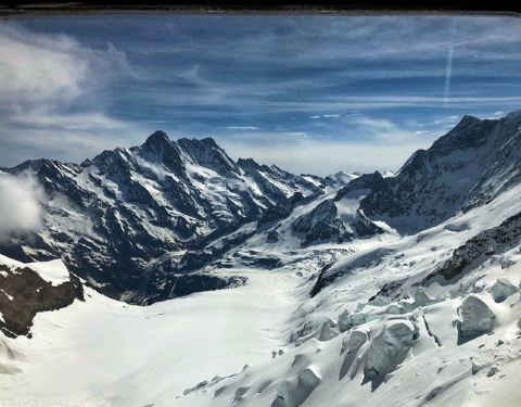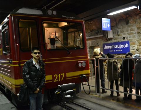 从因特拉肯乘坐齿轨火车一路爬山坡钻隧道,来到海拔3454米,欧洲最高的火车站少女峰火车站 一路上风景不错 中途还要换一次火车 充满了新鲜感!眼前的一大片白云真的是太美了