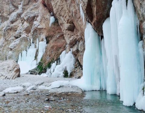 阿图什大峡谷在阿图什郊区,这里群峰林立,山势陡峭,如斧劈刀削,河水和瀑布因为天气原因结成冰,和南疆的苍凉融为一体,很适合徒步的一个地方。