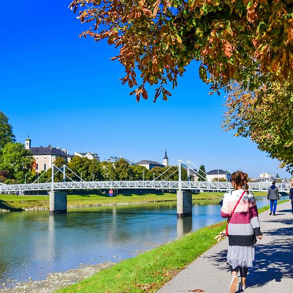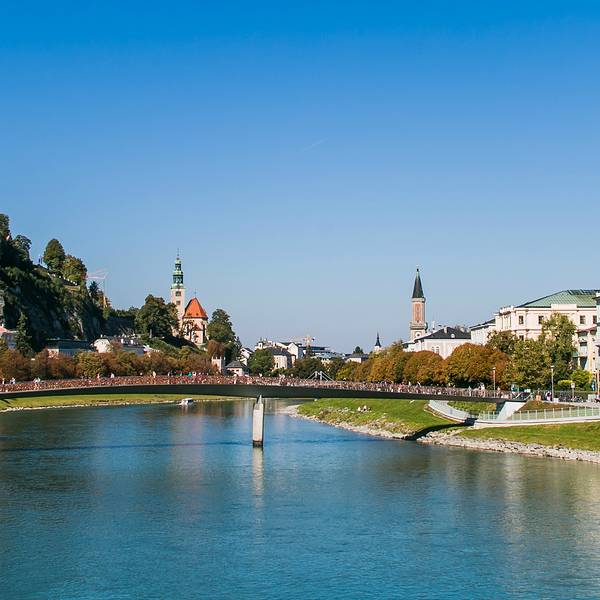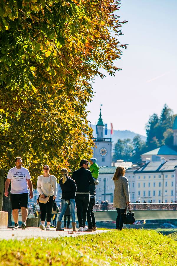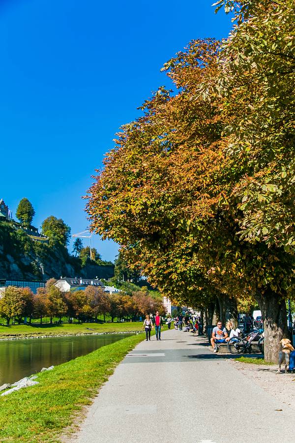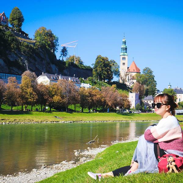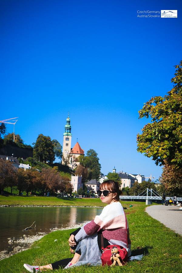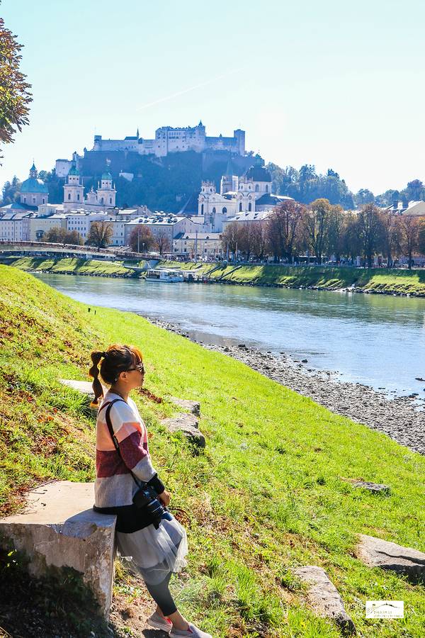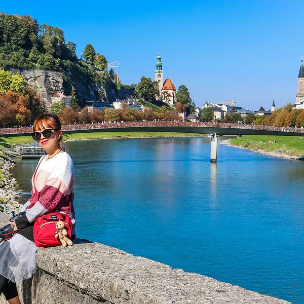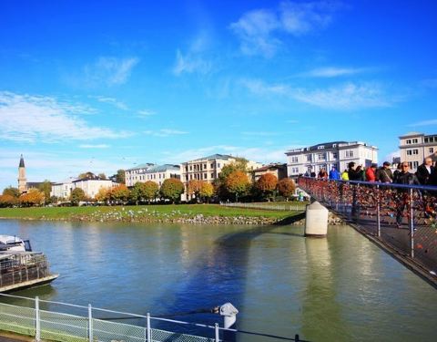 从桥上看风景也是很好的,可以看到远处的萨尔茨堡城堡,近处河岸漫坡上休息的市民,还有流过古今日夜...