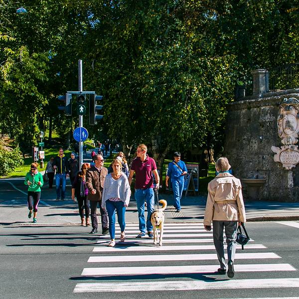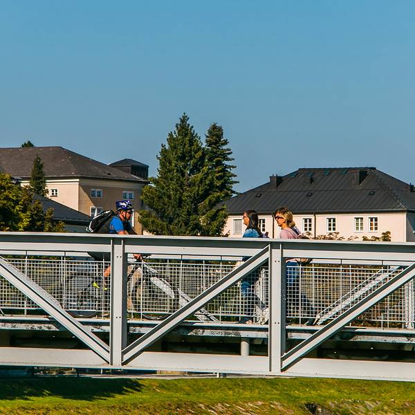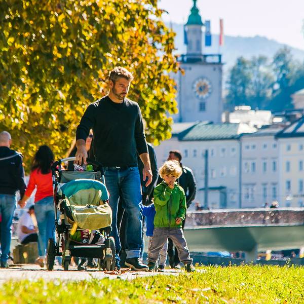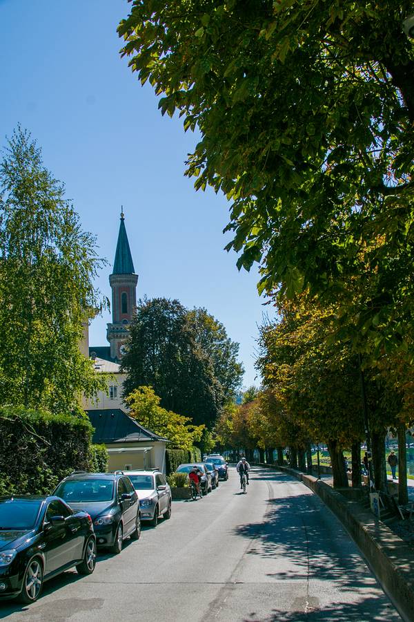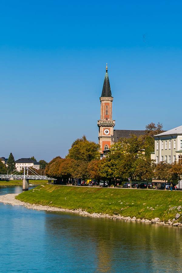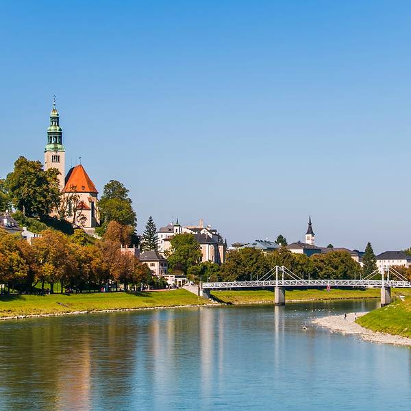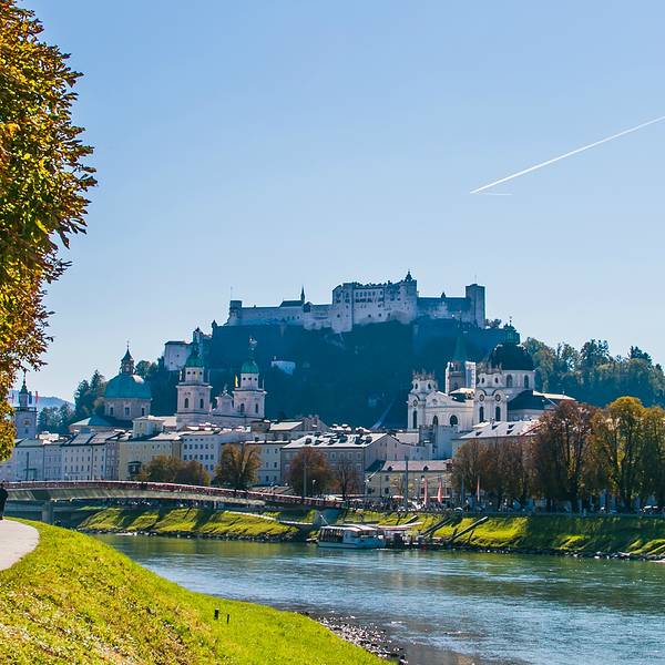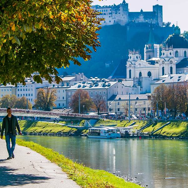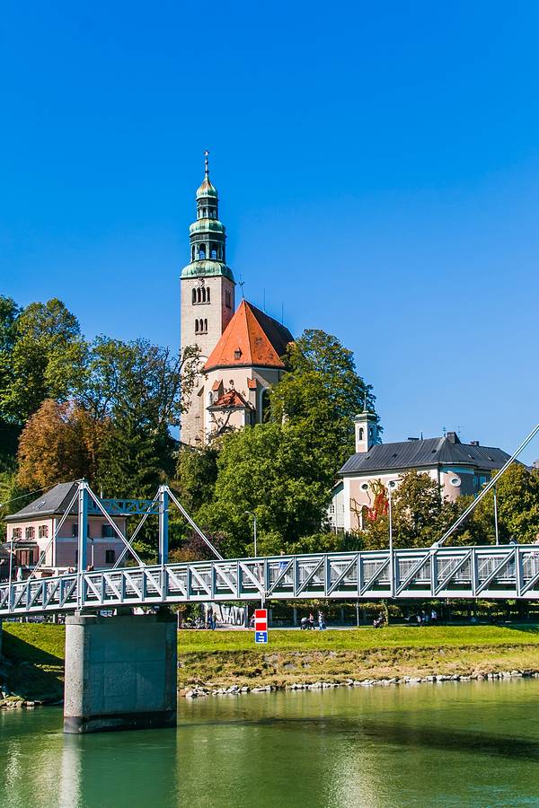 从桥上看风景也是很好的,可以看到远处的萨尔茨堡城堡,近处河岸漫坡上休息的市民,还有流过古今日夜...