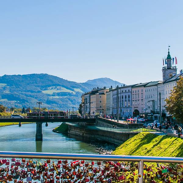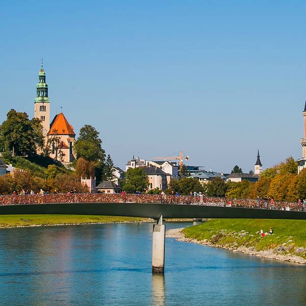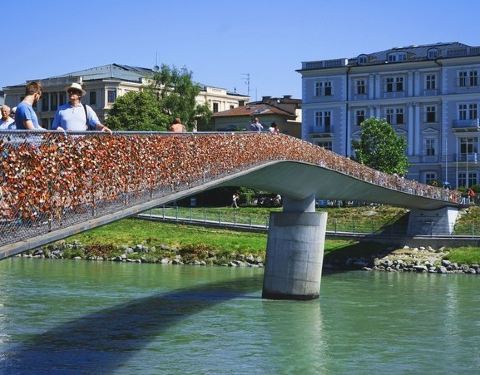 萨尔茨堡的巴克小桥是建在萨尔斯河上的一座供行人通过的小桥,也叫情人桥。桥边的护拦上锁着许多同心锁,据说许多情人到这里锁上同心锁,扔掉钥匙,寓意永不分离。从桥上看风景也是很好的,可以看到远处的萨尔茨堡城堡,近处河岸漫坡上休息的市民,还有流过古今日夜不息的河水。