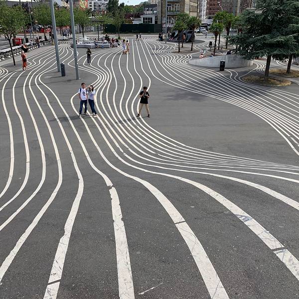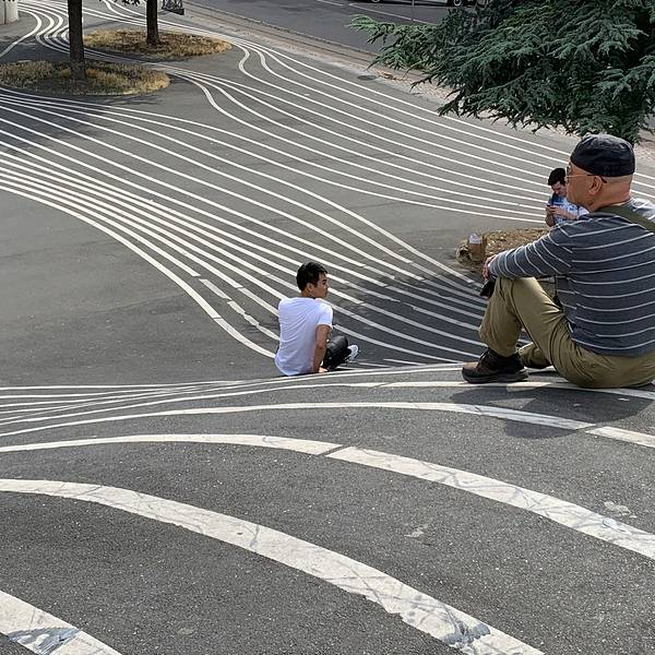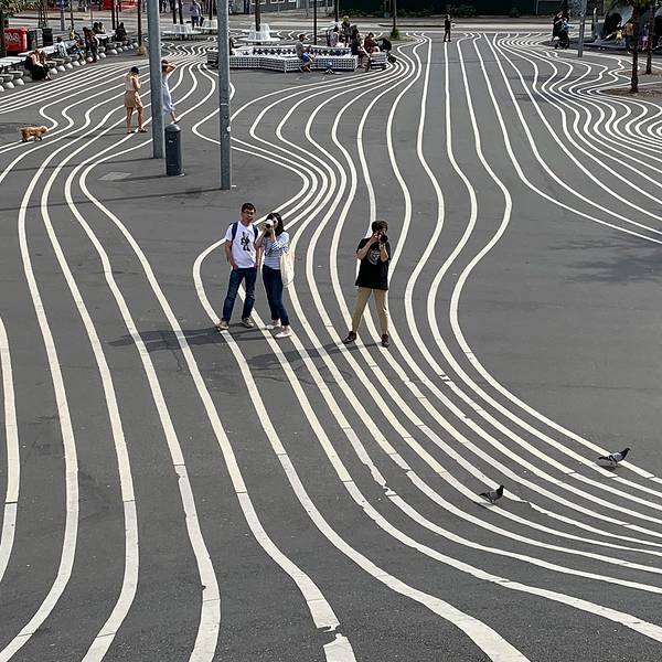 这个公园其实就是一个运动场地,起伏不停的地面被艺术家用线条来进行一种视觉上的创作,给人一种空间感和扭曲感,也挺有创意。人也多。