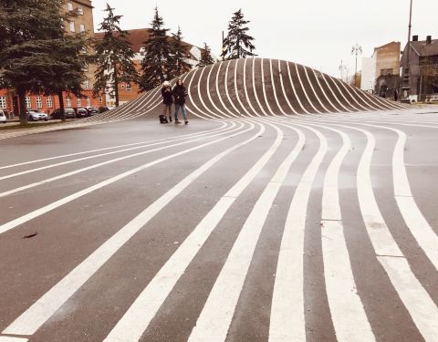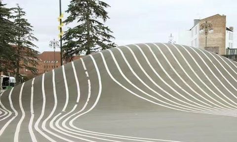 ...动场地,起伏不停的地面被艺术家用线条来进行一种视觉上的创作,给人一种空间感和扭曲感,也挺有创意