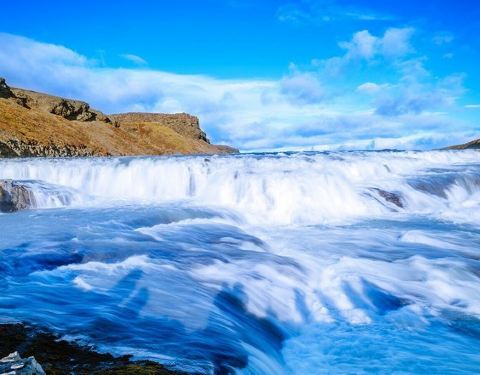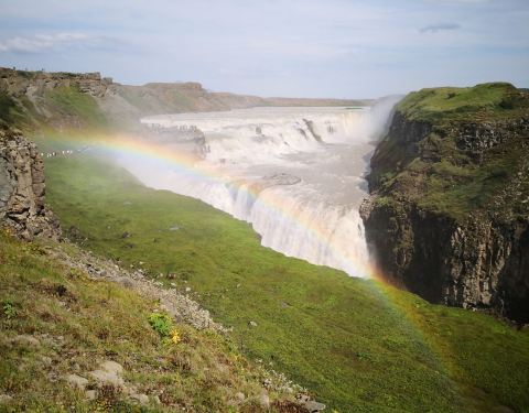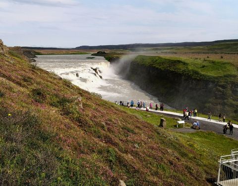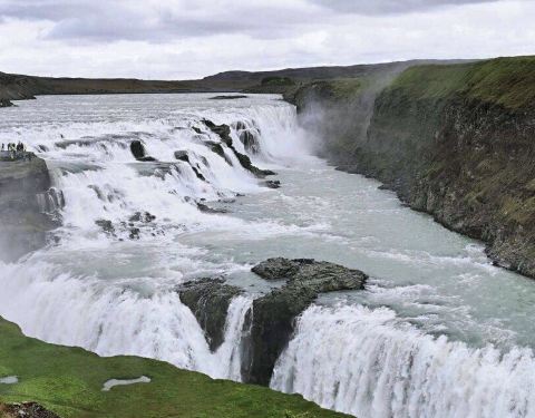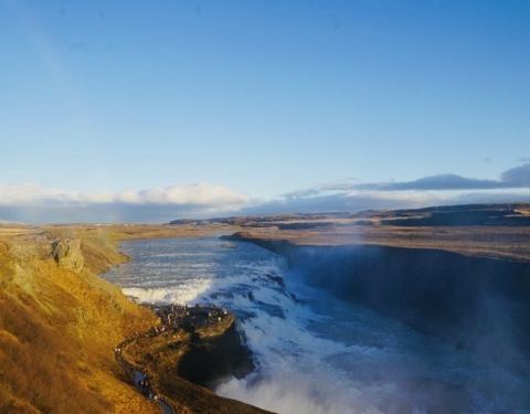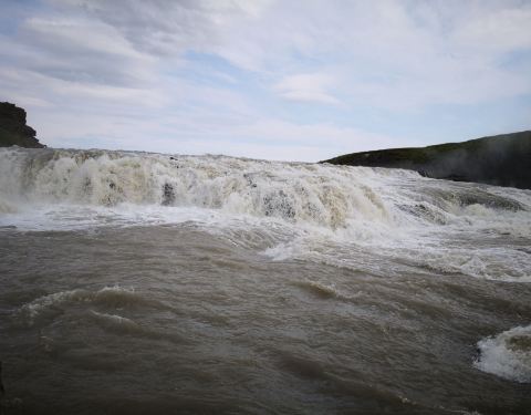 黄金瀑布也是冰岛著名的三大瀑布之一。远处便听到山谷中隆隆奔腾的水流声,走到近前,感觉整个瀑布景色壮观,气势恢宏,湍急的水流顺势而下,落差大约有50多米,瀑布水如滚滚洪流,轰鸣声声。
