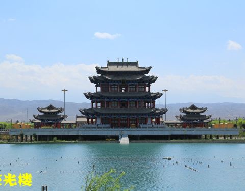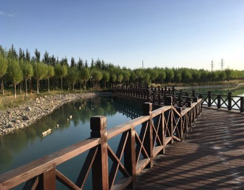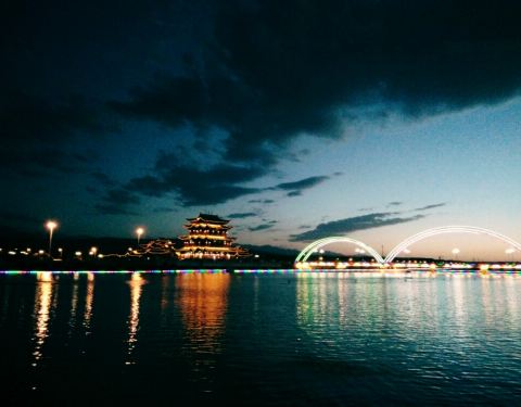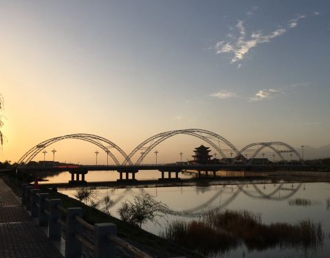 这里是嘉峪关市新建的面积最大的湿地公园,湖是人工修建的,到了晚上有喷泉和水幕电影这里是嘉峪关市新建的面积最大的湿地公园,湖是人工修建的,到了晚上有喷泉和水幕电影。河岸边的仿古楼跟嘉峪关城楼遥相呼应,天气好的时候背后的雪山轮廓清晰,景色迷人。